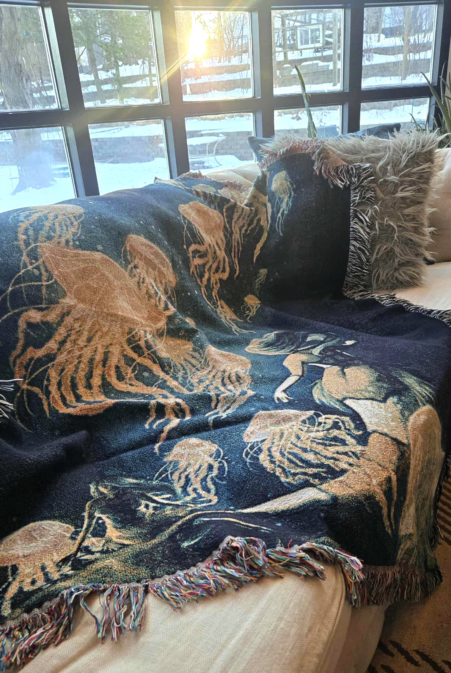 Enjoy the perfect blanket burrito or a unique wall hanging! Premium natural cotton weaving that is lightweight and soft to the touch, beautifully textured and wonderfully cozy. Made from 100% natural cotton thread, this woven artwork makes for a unique statement piece whether it's on your couch or wall.